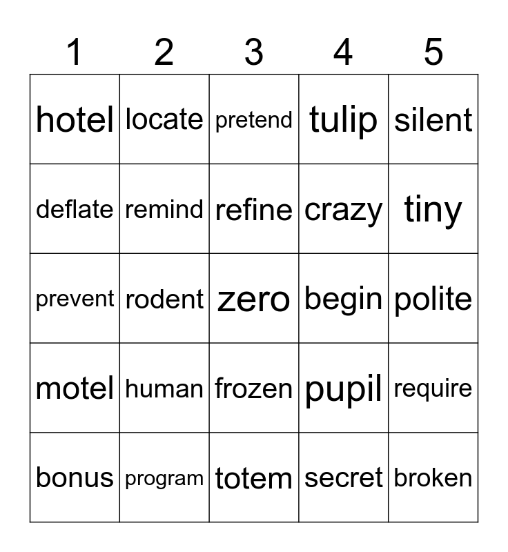 This bingo card has a free space and 24 words: human, program, refine, bonus, silent, hotel, deflate, locate, begin, frozen, crazy, prevent, pupil, require, remind, secret, polite, pretend, tiny, rodent, broken, motel, tulip and totem.