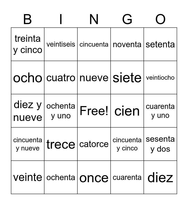 This bingo card has a free space and 44 words: cinco, diez, quince, veinte, treinta, cuarenta, cincuenta, sesenta, setenta, ochenta, noventa, cien, catorce, trece, doce, once, diez y siete, diez y nueve, veintitrés, veintiocho, veintiseis, veintisiete, treinta y dos, treinta y cinco, treinta y siete, cuarenta y uno, cuarenta y tres, cuarenta y cuatro, cincuenta y cinco, cincuenta y nueve, sesenta y ocho, sesenta y dos, setenta y siete, setenta y seis, ochenta y uno, ochenta y tres, noventa y uno, noventa y cuatro, nueve, ocho, siete, seis, cuatro and tres.