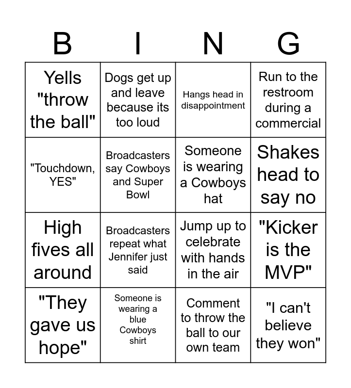 This bingo card has 16 words: Someone is wearing a blue Cowboys shirt, "Kicker is the MVP", Hangs head in disappointment, Yells "throw the ball", High fives all around, Dogs get up and leave because its too loud, Jump up to celebrate with hands in the air, Comment to throw the ball to our own team, "Touchdown, YES", Broadcasters say Cowboys and Super Bowl, "They gave us hope", Run to the restroom during a commercial, Broadcasters repeat what Jennifer just said, Shakes head to say no, Someone is wearing a Cowboys hat and "I can't believe they won".