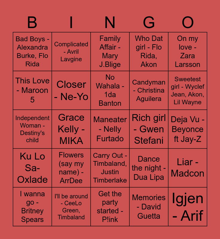 This bingo card has a free space and 24 words: Flowers (say my name) - ArrDee, I'll be around - CeeLo Green, Timbaland, No Wahala - 1da Banton, I wanna go - Britney Spears, On my love - Zara Larsson, Bad Boys - Alexandra Burke, Flo Rida, This Love - Maroon 5, Complicated - Avril Lavgine, Rich girl - Gwen Stefani, Carry Out - Timbaland, Justin Timberlake, Candyman - Christina Aguilera, Independent Woman - Destiny's child, Dance the night - Dua Lipa, Liar - Madcon, Closer - Ne-Yo, Memories - David Guetta, Deja Vu - Beyonce ft Jay-Z, Family Affair - Mary J.Blige, Sweetest girl - Wyclef Jean, Akon, Lil Wayne, Grace Kelly - MIKA, Igjen - Arif, Ku Lo Sa- Oxlade, Who Dat girl - Flo Rida, Akon and Get the party started - P!ink.