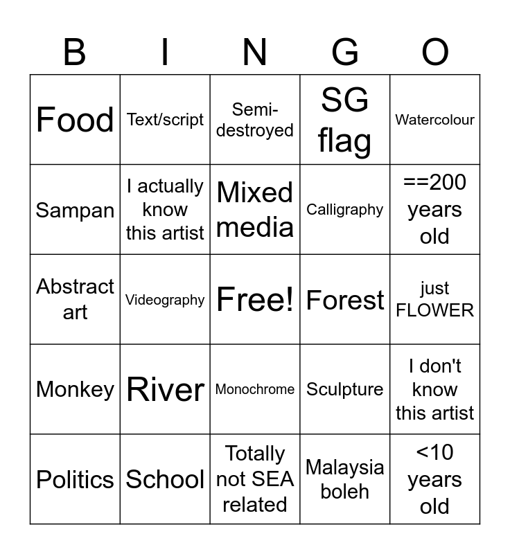 This bingo card has a free space and 24 words: River, School, Mixed media, Politics, Watercolour, Food, Sampan, Text/script, Forest, Monochrome, Calligraphy, Abstract art, Sculpture, I don't know this artist, I actually know this artist, Malaysia boleh, just FLOWER, Semi-destroyed, ==200 years old, Videography, <10 years old, Monkey, SG flag and Totally not SEA related.
