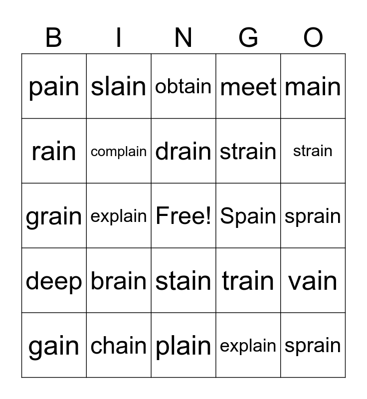 This bingo card has a free space and 24 words: brain, chain, drain, gain, main, pain, rain, slain, Spain, stain, strain, grain, train, vain, complain, explain, sprain, obtain, strain, explain, sprain, deep, meet and plain.
