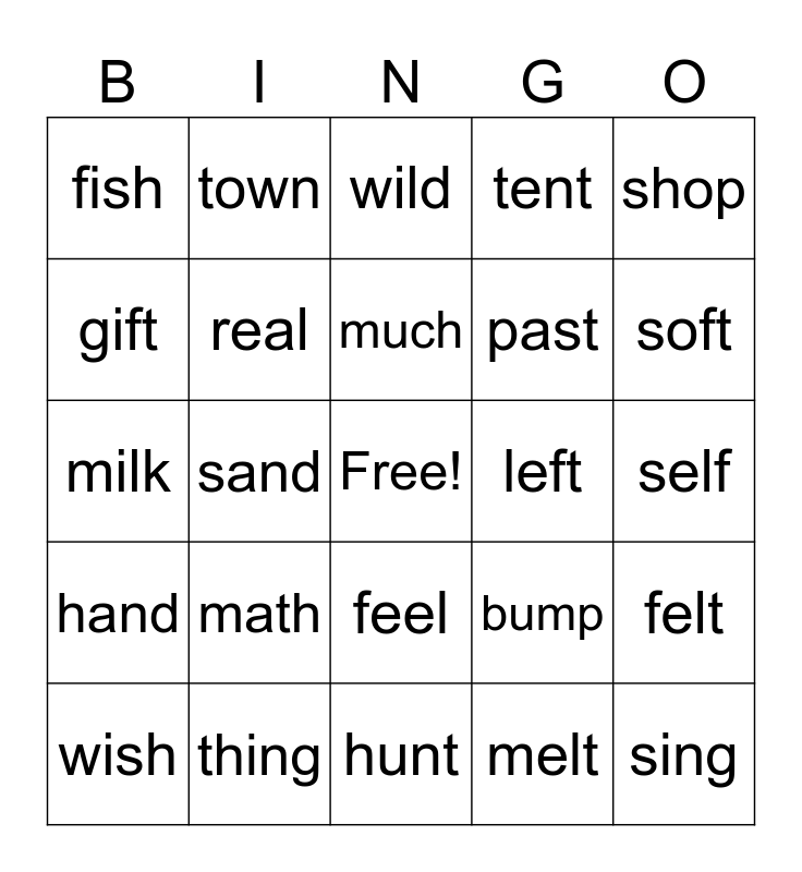 This bingo card has a free space and 24 words: math, thing, much, wish, shop, fish, gift, town, left, feel, past, milk, bump, felt, real, melt, self, wild, soft, sand, sing, hand, tent and hunt.