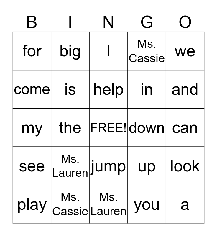 This bingo card has a free space and 24 words: Ms. Lauren, Ms. Cassie, help, play, we, for, come, big, down, jump, in, my, up, look, is, you, can, I, and, the, a, see, Ms. Cassie and Ms. Lauren.