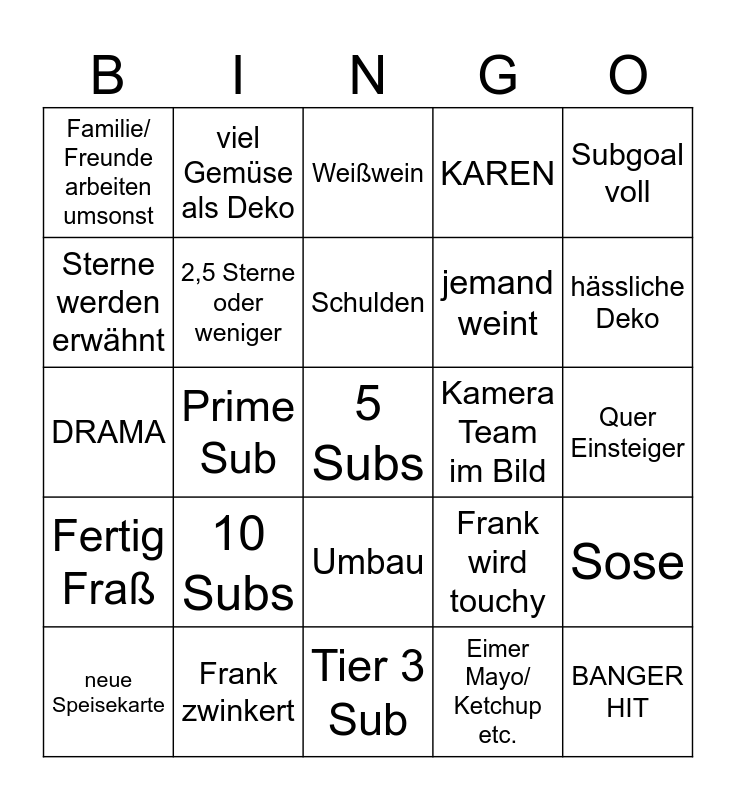 This bingo card has a free space and 24 words: 10 Subs, Frank zwinkert, Schulden, neue Speisekarte, Subgoal voll, Familie/ Freunde arbeiten umsonst, Sterne werden erwähnt, viel Gemüse als Deko, Kamera Team im Bild, Umbau, jemand weint, DRAMA, Frank wird touchy, Sose, 2,5 Sterne oder weniger, Eimer Mayo/ Ketchup etc., Quer Einsteiger, Weißwein, hässliche Deko, Prime Sub, BANGER HIT, Fertig Fraß, KAREN and Tier 3 Sub.