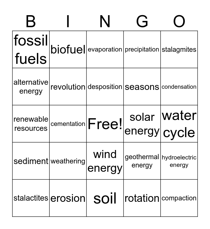This bingo card has a free space and 24 words: weathering, erosion, desposition, stalactites, stalagmites, fossil fuels, alternative energy, biofuel, solar energy, wind energy, seasons, renewable resources, geothermal energy, hydroelectric energy, revolution, rotation, water cycle, evaporation, condensation, cementation, compaction, sediment, precipitation and soil.
