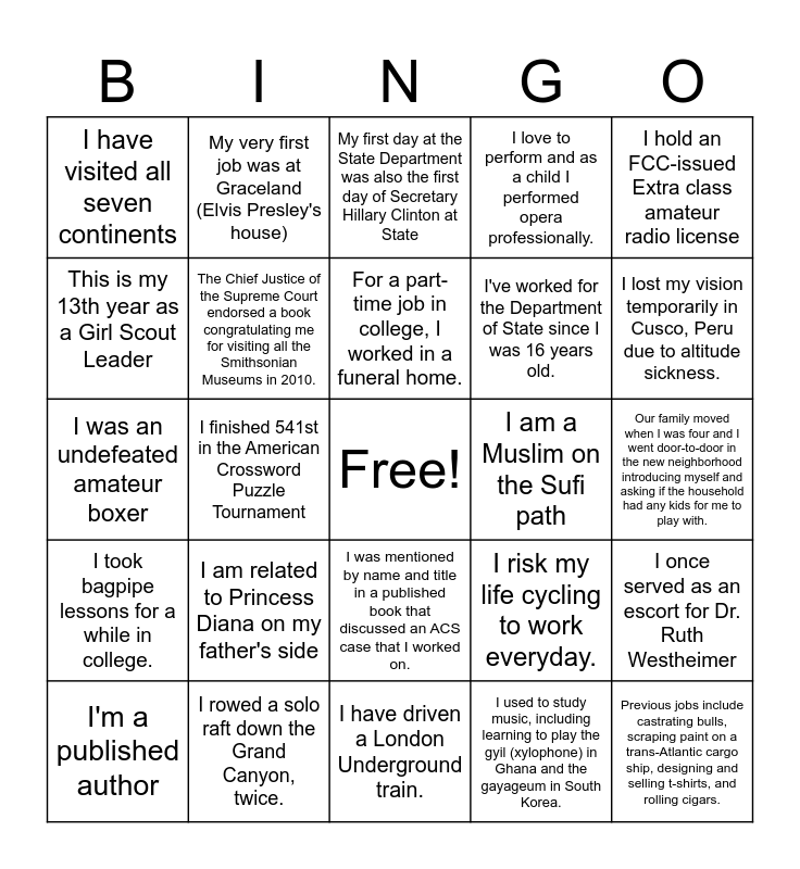 This bingo card has a free space and 24 words: I am related to Princess Diana on my father's side, I rowed a solo raft down the Grand Canyon, twice., For a part-time job in college, I worked in a funeral home., I'm a published author, I hold an FCC-issued Extra class amateur radio license, I have visited all seven continents, This is my 13th year as a Girl Scout Leader, My very first job was at Graceland (Elvis Presley's house), I am a Muslim on the Sufi path, I was mentioned by name and title in a published book that discussed an ACS case that I worked on., I've worked for the Department of State since I was 16 years old., I was an undefeated amateur boxer, I risk my life cycling to work everyday., I once served as an escort for Dr. Ruth Westheimer, The Chief Justice of the Supreme Court endorsed a book congratulating me for visiting all the Smithsonian Museums in 2010., I used to study music, including learning to play the gyil (xylophone) in Ghana and the gayageum in South Korea., Our family moved when I was four and I went door-to-door in the new neighborhood introducing myself and asking if the household had any kids for me to play with., My first day at the State Department was also the first day of Secretary Hillary Clinton at State, I lost my vision temporarily in Cusco, Peru due to altitude sickness., I finished 541st in the American Crossword Puzzle Tournament, Previous jobs include castrating bulls, scraping paint on a trans-Atlantic cargo ship, designing and selling t-shirts, and rolling cigars., I took bagpipe lessons for a while in college., I love to perform and as a child I performed opera professionally. and I have driven a London Underground train..