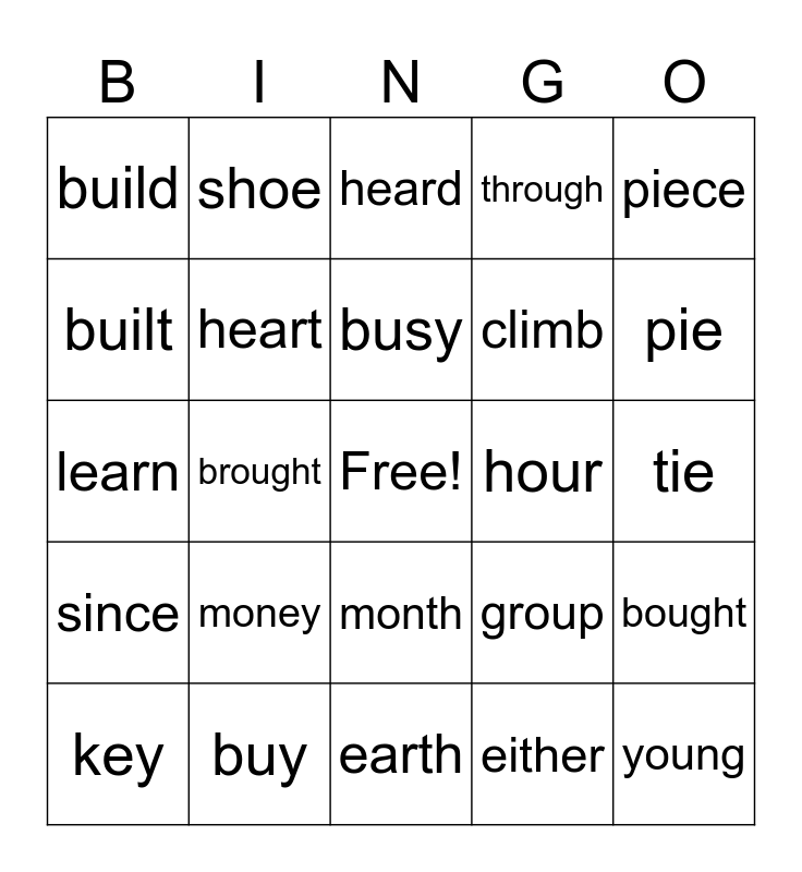 This bingo card has a free space and 24 words: money, buy, busy, key, piece, build, built, shoe, hour, month, climb, learn, group, bought, heart, either, tie, heard, pie, brought, young, since, through and earth.