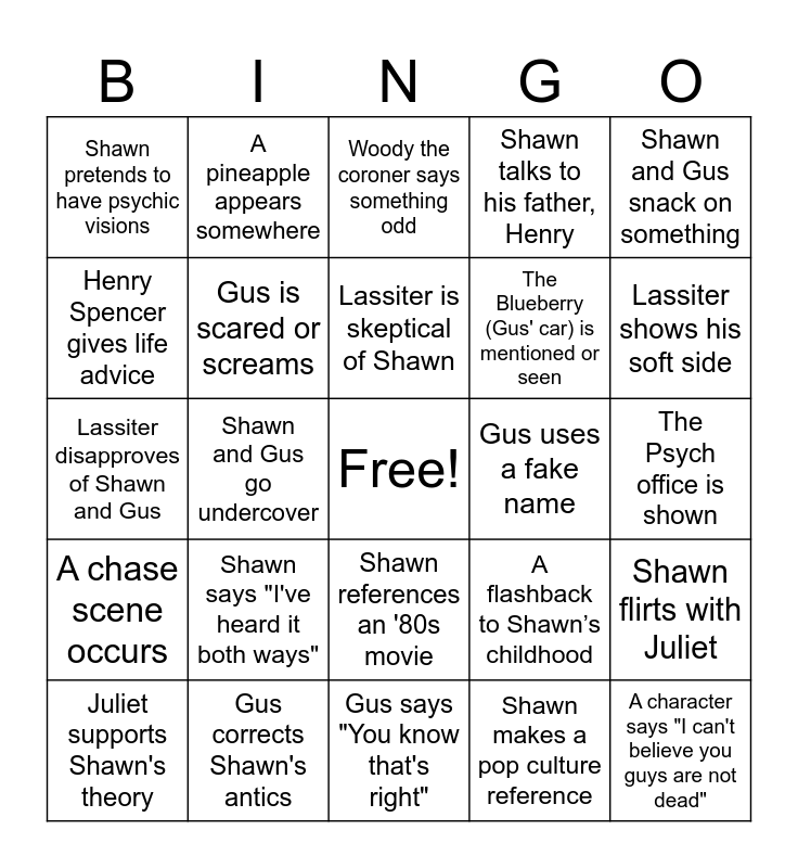 This bingo card has a free space and 24 words: Shawn says "I've heard it both ways", Gus corrects Shawn's antics, Lassiter is skeptical of Shawn, Juliet supports Shawn's theory, Shawn and Gus snack on something, Shawn pretends to have psychic visions, Henry Spencer gives life advice, A pineapple appears somewhere, Gus uses a fake name, Shawn references an '80s movie, The Blueberry (Gus' car) is mentioned or seen, Lassiter disapproves of Shawn and Gus, A flashback to Shawn’s childhood, Shawn flirts with Juliet, Gus is scared or screams, Shawn makes a pop culture reference, The Psych office is shown, Woody the coroner says something odd, Lassiter shows his soft side, Shawn and Gus go undercover, A character says "I can't believe you guys are not dead", A chase scene occurs, Shawn talks to his father, Henry and Gus says "You know that's right".
