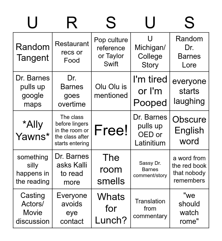 This bingo card has a free space and 24 words: Dr. Barnes asks Kalli to read more, Everyone avoids eye contact, Olu Olu is mentioned, Casting Actors/ Movie discussion, Random Dr. Barnes Lore, Random Tangent, Dr. Barnes pulls up google maps, Restaurant recs or Food, Dr. Barnes pulls up OED or Latinitium, The room smells, I'm tired or I'm Pooped, *Ally Yawns*, Sassy Dr. Barnes comment/story, a word from the red book that nobody remembers, Dr. Barnes goes overtime, Translation from commentary, Obscure English word, Pop culture reference or Taylor Swift, everyone starts laughing, The class before lingers in the room or the class after starts entering, "we should watch rome", something silly happens in the reading, U Michigan/ College Story and Whats for Lunch?.