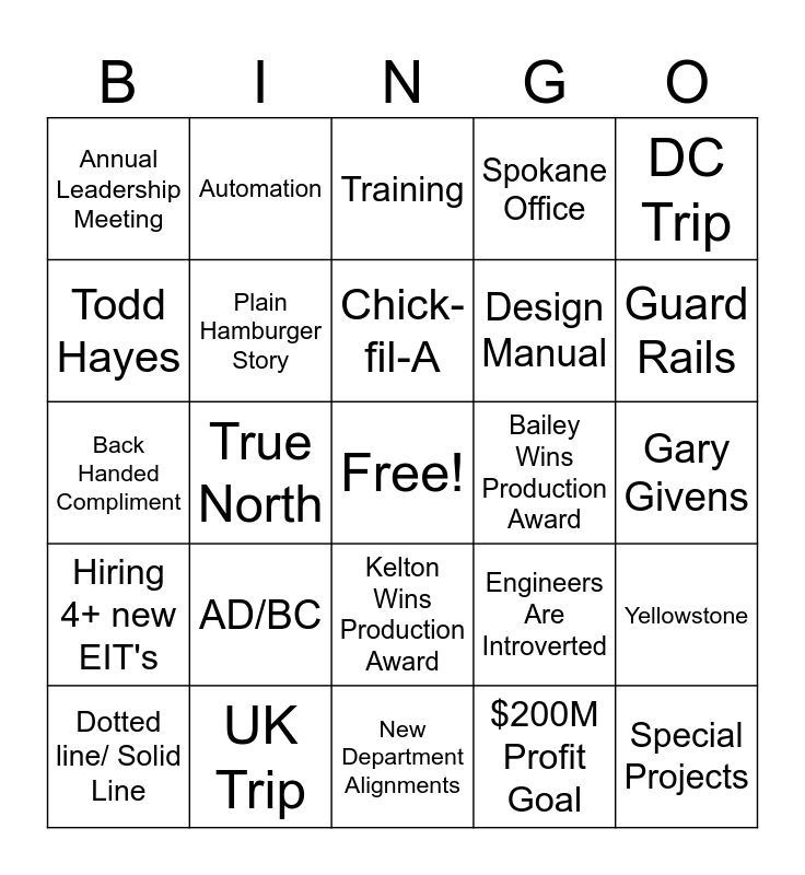 This bingo card has a free space and 24 words: AD/BC, UK Trip, Chick-fil-A, Dotted line/ Solid Line, DC Trip, Annual Leadership Meeting, Todd Hayes, Automation, Bailey Wins Production Award, Kelton Wins Production Award, Design Manual, Back Handed Compliment, Engineers Are Introverted, Yellowstone, Plain Hamburger Story, $200M Profit Goal, Gary Givens, Training, Guard Rails, True North, Special Projects, Hiring 4+ new EIT's, Spokane Office and New Department Alignments.