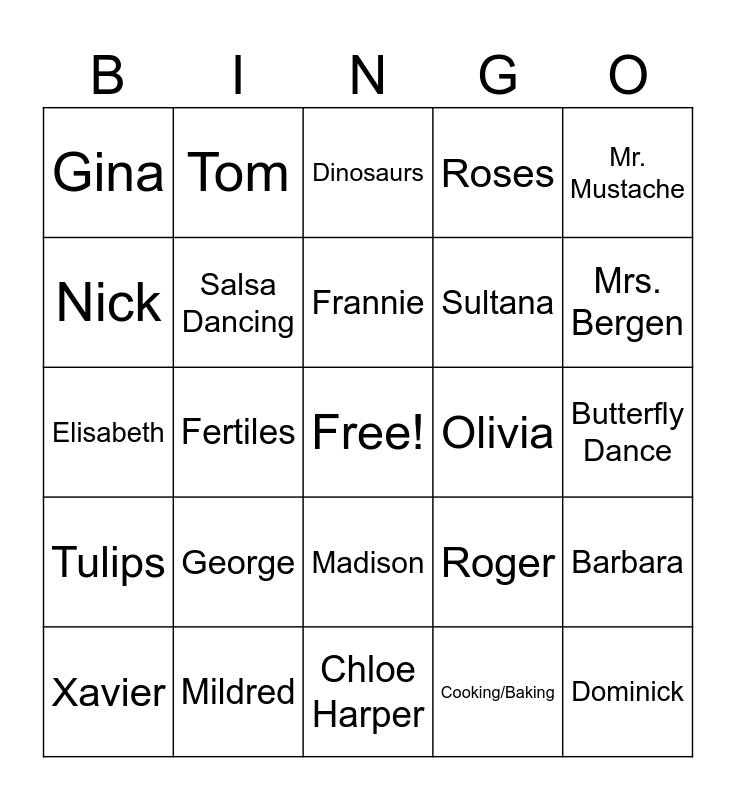 This bingo card has a free space and 24 words: George, Mildred, Frannie, Xavier, Mr. Mustache, Gina, Nick, Tom, Olivia, Madison, Sultana, Elisabeth, Roger, Barbara, Salsa Dancing, Cooking/Baking, Butterfly Dance, Dinosaurs, Mrs. Bergen, Fertiles, Dominick, Tulips, Roses and Chloe Harper.
