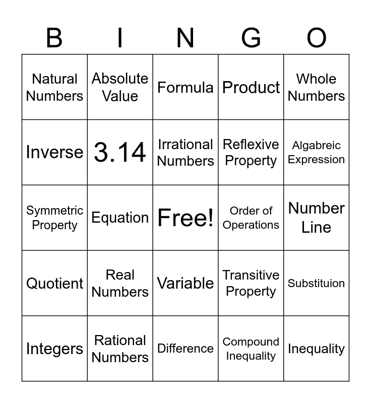 This bingo card has a free space and 24 words: Real Numbers, Rational Numbers, Irrational Numbers, Integers, Whole Numbers, Natural Numbers, Inverse, Absolute Value, Order of Operations, Variable, Reflexive Property, Symmetric Property, Transitive Property, Substituion, 3.14, Compound Inequality, Number Line, Formula, Algabreic Expression, Equation, Inequality, Quotient, Product and Difference.
