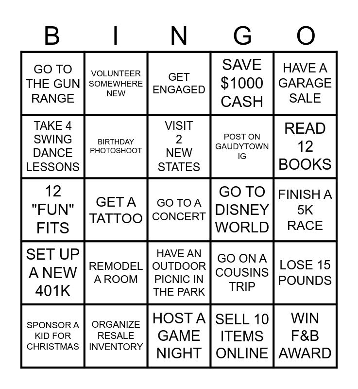 This bingo card has a free space and 24 words: REMODEL A ROOM, ORGANIZE RESALE INVENTORY, VISIT 2 NEW STATES, SPONSOR A KID FOR CHRISTMAS, HAVE A GARAGE SALE, GO TO THE GUN RANGE, TAKE 4 SWING DANCE LESSONS, VOLUNTEER SOMEWHERE NEW, GO TO DISNEY WORLD, HAVE AN OUTDOOR PICNIC IN THE PARK, POST ON GAUDYTOWN IG, 12 "FUN" FITS, GO ON A COUSINS TRIP, LOSE 15 POUNDS, BIRTHDAY PHOTOSHOOT, SELL 10 ITEMS ONLINE, FINISH A 5K RACE, GET ENGAGED, READ 12 BOOKS, GET A TATTOO, WIN F&B AWARD, SET UP A NEW 401K, SAVE $1000 CASH and HOST A GAME NIGHT.