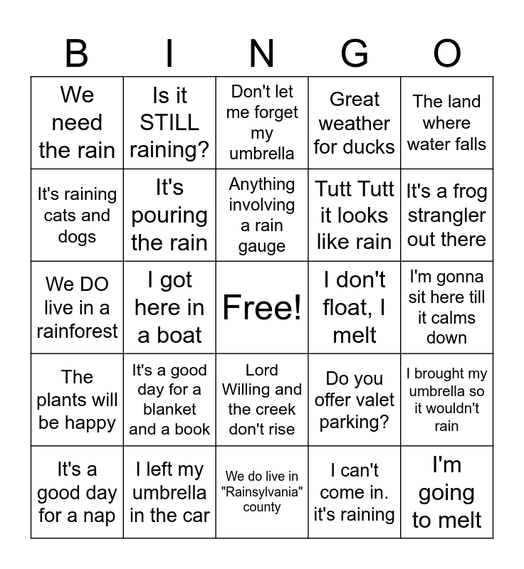 This bingo card has a free space and 24 words: It's a good day for a nap, It's a good day for a blanket and a book, Anything involving a rain gauge, I can't come in. it's raining, The land where water falls, We need the rain, Is it STILL raining?, Don't let me forget my umbrella, I don't float, I melt, I'm gonna sit here till it calms down, We DO live in a rainforest, It's pouring the rain, Do you offer valet parking?, I brought my umbrella so it wouldn't rain, It's raining cats and dogs, I left my umbrella in the car, We do live in "Rainsylvania" county, Great weather for ducks, It's a frog strangler out there, The plants will be happy, I got here in a boat, Lord Willing and the creek don't rise, Tutt Tutt it looks like rain and I'm going to melt.