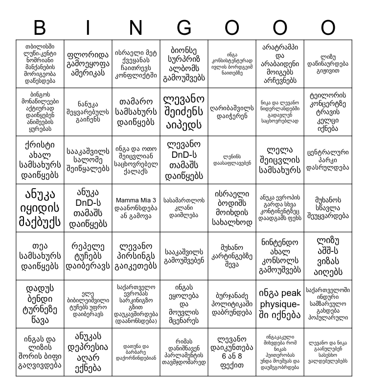 This bingo card has 163 words: ლიზუ ვარჯიშს დაიწყებს, ლიზუ სეივინგების გაკეთებას დაიწყებს, ლიზუ აშშ-ს ვიზას აიღებს, კალაძე გაპრემიერდება, ანიკა და ჟორა მეფე ნარიმანის მრევლი გახდებიან, ანიკას პადრუგა ხათუნა განიკურნება კიბოსგან, პატრიარქი მოკვდება, ანიკა პოლიტიკაში მოვა, ტრამპი მოიგებს არჩევნებს, ბაიდენი მოიგებს არჩევნებს, არატრამპი და არაბაიდენი მოიგებს არჩევნებს, პუტინი ჩაძაღლდება, ისრაელი მეტ ქვეყანას ჩაითრევს კონფლიქტში, საქართველოში მემარცხენე პარტია იყრის კენჭს და პარლამენტში შევა, ლენინს დაასაფლავებენ, ანუკას იმუნიტეტი გაუუმჯობესდება, ნიკი მინაჯის კონცერტზე წავლენ ლევანო და ნიკა, თამარო დაორსულდება, შოთა დარბაიძე ბინას იყიდის, ურსულა სკანდალით წავა, ჯეფ ბეზოსი წარმატებით გაფრინდება კოსმოსში, ბიძინა ფულს დაარიგებს, კალიფორნიაში ფსიქედელიკ დრაგები ლეგალური გახდება, საქართველოში ინდური სამზარეულო გახდება პოპულარული, ლევანო თემურ უგულავას პირადად გაიცნობს, თბილისში ქოლდფლეის კონცერტი ჩატარდება, თბილისში ლუწი-კენტი ნომრიანი მანქანების მორიგეობა დაწესდება, თეა სამსახურს დაიწყებს, ტრამპს დაიჭერენ, ჰამილტონი გახდება ფორმულა 1-ის ჩემპიონი, ბინგოს მონაწილეები ახალ ჰობიებს შეიძენენ, დვთ სლოვენიაში წავა, ინგა კონსისტენტურად ივლის ბორდგეიმ ნაითებზე, ინგას და ლიზის შორის ბიფი გაღვივდება, ინგას აქციების მოგება 25%-ზე მეტი იქნება, ინგა სახლში ნახატებს / პოსტერებს დაკიდებს, ტეილორის კონცერტის მერე ინგას ყველაზე მეტი ბრასლეტი ექნება, ლიზუ დაიწყებს მეტ ექსპერიმენტაციას მეიქაფით, ელენე და თემო ერთად დარჩებიან, ლიზუ hoe era take 2, ინგა peak physique-ში იქნება, ნიკა პირსინგს გაიკეთებს, ლევანო პირსინგს გაიკეთებს, ანიკა 50 წლის რომ გახდება თრიფში წავა, სააკაშვილის დედა გათხოვდება, ქრისტი ახალ სამსახურს დაიწყებს, გაერო დაიშლება, ქეთა სიორიძე გათხოვდება, რიმას დანიშნავენ პარლამენტის თავმჯდომარედ, ანა ვინტური დაქენსელდება, ლედი გაგა ახალ ალბომს გამოუშვებს, დათუნა და ბარბარე დაქორწინდებიან, რუპოლი პენსიაზე გავა, დადუს ბენდი ტურნეზე წავა, A-list cheating scandal, ორზე მეტი სთრიმინგ სერვისი გაერთიანდება, ნიკას ახალი ოპტიკური სათვალე ექნება და ის იქნება funky, Mamma Mia 3 დაანონსდება ან გამოვა, სელენა და ჯასტინი დარიუნაითდებიან, ფრენკ ოკეანე დაბრუნდება, ინგას ეყოლება და მოუვლის მცენარეს, ანუკა ევროპის გარდა სხვა კონტინენტზეც დაადგამს ფეხს, ანუკა იყიდის მაქბუქს, ლევანო დაიკუნთება 6 ან 8 ფექით, ანუკა გახდება, ინგა იყიდის ტელეფონს, ინგა და ოთო შეიცვლიან საცხოვრებელ ქალაქს, მუხანო ბიზნესს დაი