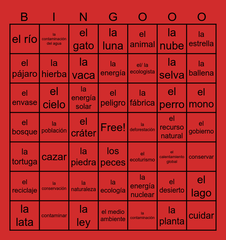 This bingo card has a free space and 61 words: el árbol, el bosque, el bosque tropical, el cielo, el cráter, el desierto, la estrella, la flor, la hierba, el lago, la luna, la naturaleza, la nube, la piedra, la planta, el río, la selva, el animal, el ave, el pájaro, la ballena, el gato, el mono, el perro, el pez, los peces, la tortuga, la tortuga marina, la vaca, el calentamiento global, el cambio climático, la conservación, la contaminación, la contaminación del aire, la contaminación del agua, la deforestación, la ecología, el/ la ecologista, el ecoturismo, la energía, la energía nuclear, la energía solar, el envase, la extinción, la fábrica, el gobierno, la lata, la ley, el medio ambiente, el peligro, la población, la sobre población, el reciclaje, el recurso natural, la solución, cazar, conservar, contaminar, controlar, cuidar and dejar.