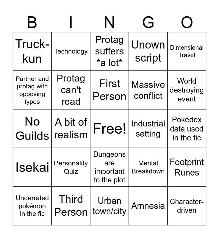This bingo card has a free space and 24 words: Personality Quiz, Third Person, First Person, Underrated pokémon in the fic, Dimensional Travel, Truck-kun, Partner and protag with opposing types, Technology, Industrial setting, Dungeons are important to the plot, Massive conflict, No Guilds, Mental Breakdown, Footprint Runes, Protag can't read, Amnesia, Pokédex data used in the fic, Protag suffers *a lot*, World destroying event, A bit of realism, Character-driven, Isekai, Unown script and Urban town/city.