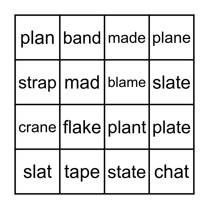 This bingo card has 19 words: plant, crack, made, chat, plate, strap, state, plan, band, crane, flake, mad, blame, tape, slat, flame, plane, slate and tap.