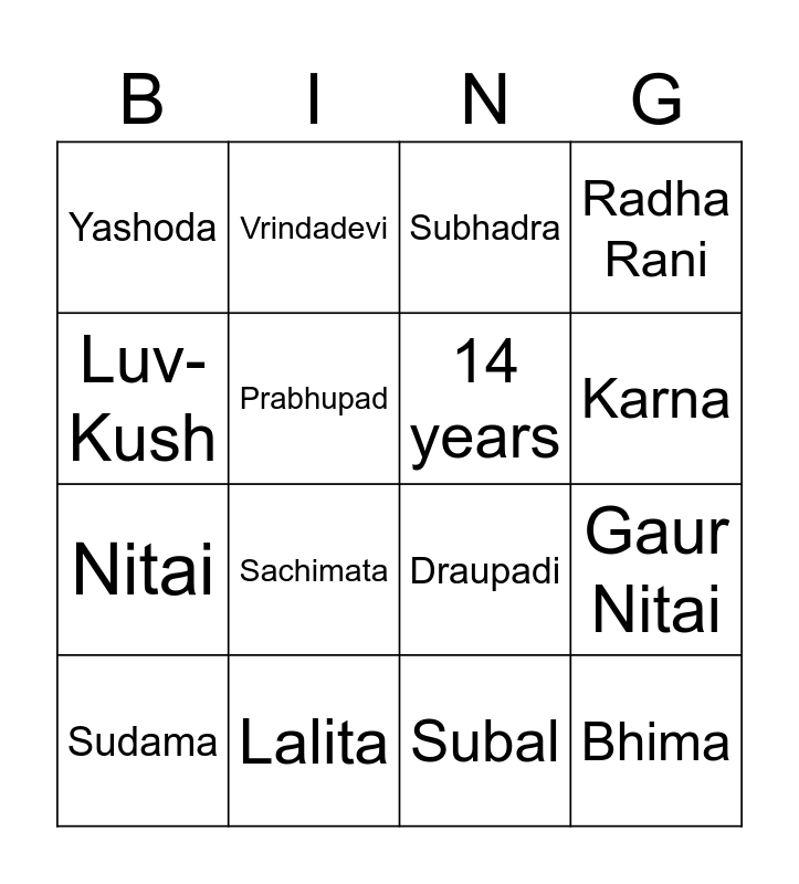 This bingo card has 40 words: Free!, Draupadi, Sandhipani muni, 14 years, 7, Sanjeevani, Karna, Arjun, Luv-Kush, Bhima, Gaur Nitai, Radha Rani, Sudama, Subal, Lalita, Vishaka, Kirtida, Yashoda, NandMaharaj, Subhadra, Balram, Nimai, Nitai, Prabhupad, 700, 12, Shabri, Ring, Janak Maharaj, DashrathMaharaj, 3, Kunti, Advait Acharya, Jhanva mata, Sachimata, Vishnupriya, Paduka (slippers), 2 boys, Vrindadevi and RadhaKund.