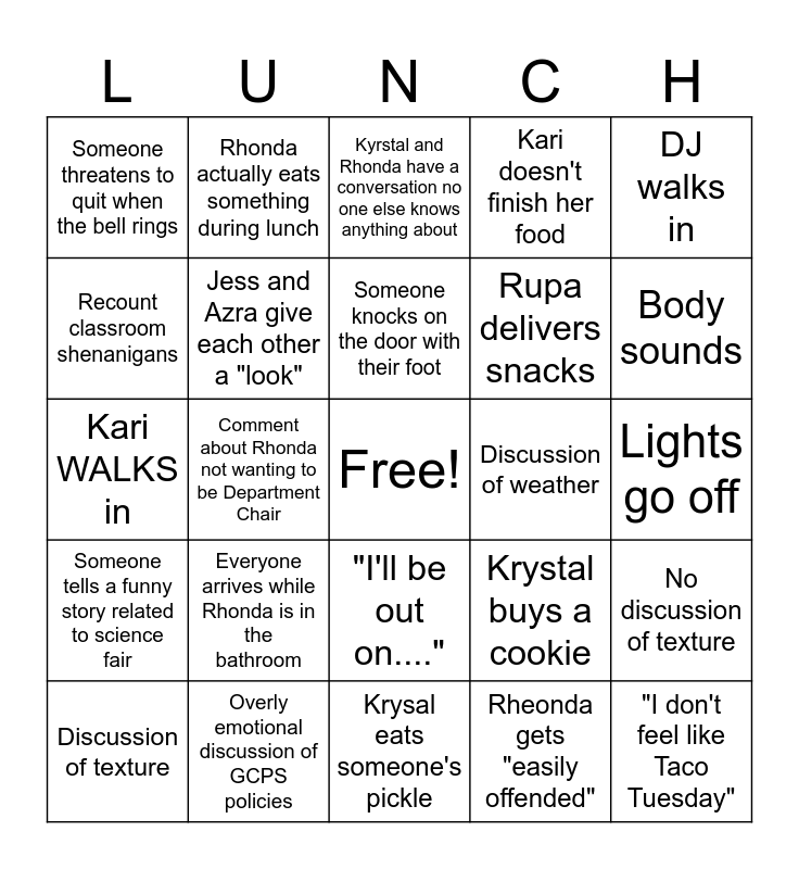 This bingo card has a free space and 29 words: Discussion of texture, Overly emotional discussion of cafeteria food, Comment about Rhonda not wanting to be Department Chair, A male attends lunch with us, Someone threatens to quit when the bell rings, Kyrstal and Rhonda have a conversation no one else knows anything about, Jess and Azra give each other a "look", Everyone arrives while Rhonda is in the bathroom, Discussion of weather, Overly emotional discussion of GCPS policies, Lights go off, "I don't feel like Taco Tuesday", Krysal eats someone's pickle, Rheonda gets "easily offended", Body sounds, Complaining about test questions, "I'll be out on....", Someone tells a funny story related to science fair, DJ walks in, Kari WALKS in, Krystal buys a cookie, Holly eats Robert's ramen, Rupa delivers snacks, Recount classroom shenanigans, Kari doesn't finish her food, Rhonda actually eats something during lunch, No discussion of texture, Someone knocks on the door with their foot and "If you quit, I'll quit.".