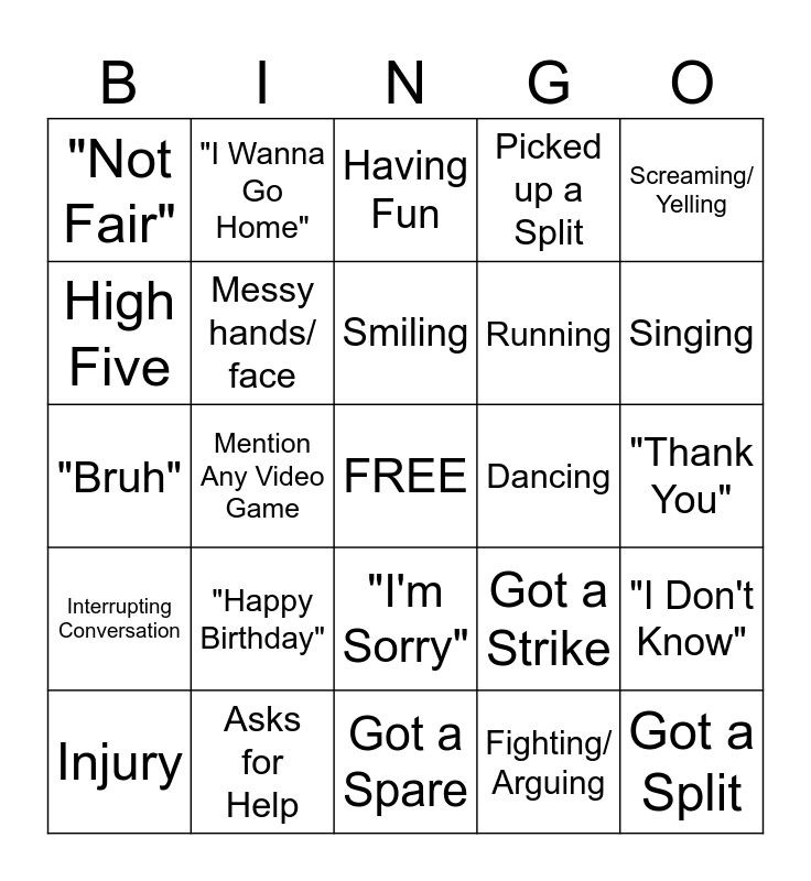 This bingo card has a free space and 34 words: Complaints/ Whining, Fighting/ Arguing, Crying, "I'm Bored", Interrupting Conversation, Messy hands/ face, Screaming/ Yelling, Injury, "I Wanna Go Home", Laughing, Smiling, Having Fun, Sore Loser, Good Sport, Dancing, Singing, Asks for Help, "Bruh", "Happy Birthday", Got a Strike, "I'm Sorry", Talking Non-Stop, "Not Fair", "Thank You", Got a Spare, Got a Split, Picked up a Split, Jumping, Running, High Five, "I'm Hungry", Mention Any Video Game, "I Don't Know" and Sharing.
