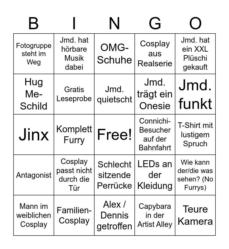 This bingo card has a free space and 26 words: Schlecht sitzende Perrücke, Capybara in der Artist Alley, Jmd. quietscht, Familien-Cosplay, Jmd. hat ein XXL Plüschi gekauft, Fotogruppe steht im Weg, Hug Me-Schild, Jmd. hat hörbare Musik dabei, T-Shirt mit lustigem Spruch, LEDs an der Kleidung, Jmd. trägt ein Onesie, Jinx, Wie kann der/die was sehen? (No Furrys), Mann im weiblichen Cosplay, Komplett Furry, Cosplay versperrt den Weg, Cosplay aus Realserie, Antagonist, OMG-Schuhe, Teure Kamera, Jmd. funkt, Alex / Dennis getroffen, Connichi-Besucher auf der Bahnfahrt, Cosplay passt nicht durch die Tür, Gratis Leseprobe and Geschminkte Narbe.