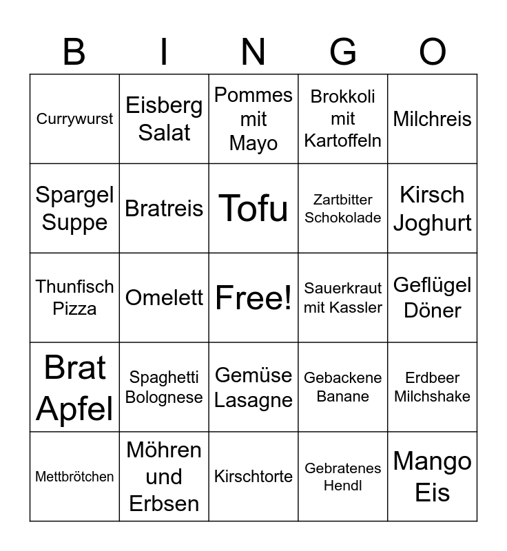 This bingo card has a free space and 29 words: Mettbrötchen, Brot mit Käse, Omelett, Käseauflauf, Currywurst, Pommes mit Mayo, Bratreis, Spaghetti Bolognese, Sauerkraut mit Kassler, Möhren und Erbsen, Geflügel Döner, Mango Eis, Kirschtorte, Gebratenes Hendl, Kirsch Joghurt, Schwarzer Kaffee, Gemüse Lasagne, Brat Apfel, Milchreis, Thunfisch Pizza, Gebackene Banane, Tomaten Sandwich, Zartbitter Schokolade, Spargel Suppe, Brokkoli mit Kartoffeln, Eisberg Salat, Erdbeer Milchshake, Tofu and Sushi und Sashimi.