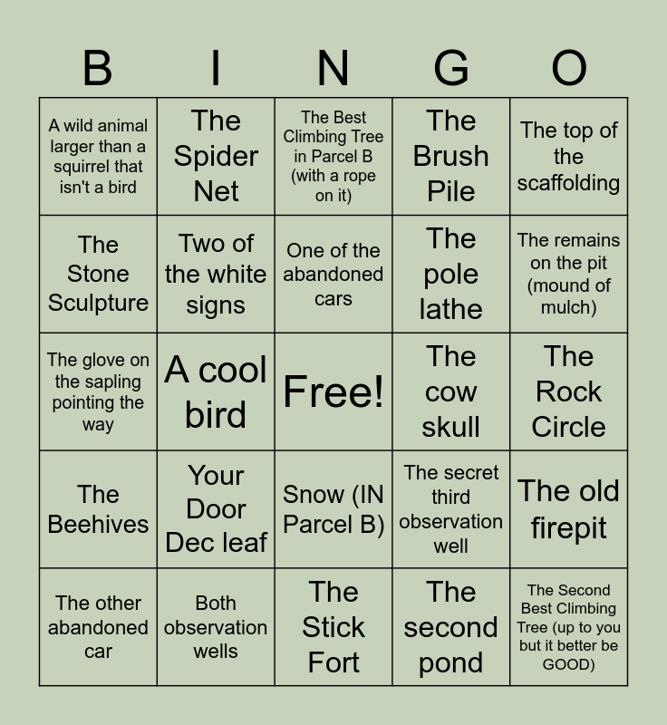 This bingo card has a free space and 24 words: Your Door Dec leaf, Both observation wells, One of the abandoned cars, The other abandoned car, The top of the scaffolding, A wild animal larger than a squirrel that isn't a bird, The Stone Sculpture, The Spider Net, The cow skull, Snow (IN Parcel B), The pole lathe, The glove on the sapling pointing the way, The secret third observation well, The old firepit, Two of the white signs, The second pond, The Rock Circle, The Best Climbing Tree in Parcel B (with a rope on it), The remains on the pit (mound of mulch), A cool bird, The Second Best Climbing Tree (up to you but it better be GOOD), The Beehives, The Brush Pile and The Stick Fort.
