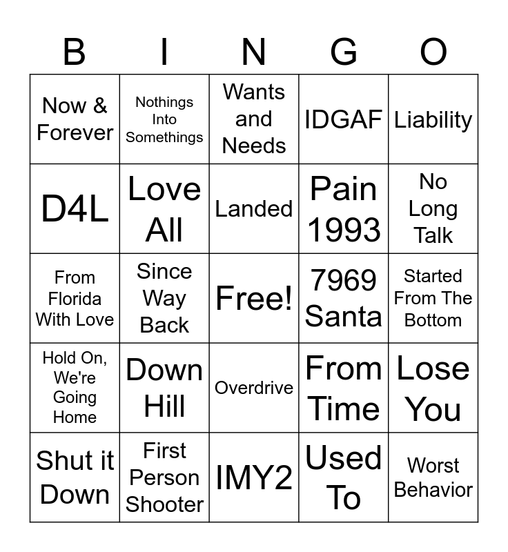 This bingo card has a free space and 44 words: Papi's Home, Worst Behavior, You Broke My Heart, Shut it Down, Take Care, Used To, Wants and Needs, My Side, Liability, First Person Shooter, IDGAF, 7969 Santa, Overdrive, Down Hill, Jimmy Crooks, IMY2, Losses, From Florida With Love, Demons, No Long Talk, Nothings Into Somethings, Scholarships, Plastic Bag, Now & Forever, HYFR, Started From The Bottom, Wu-Tang Forever, Own It, From Time, Hold On, We're Going Home, Connect, Lose You, Can't Have Everything, Glow, Since Way Back, Fake Love, Desires, Time Flies, Landed, D4L, Pain 1993, Girls Want Girls, Love All and Rich Flex.