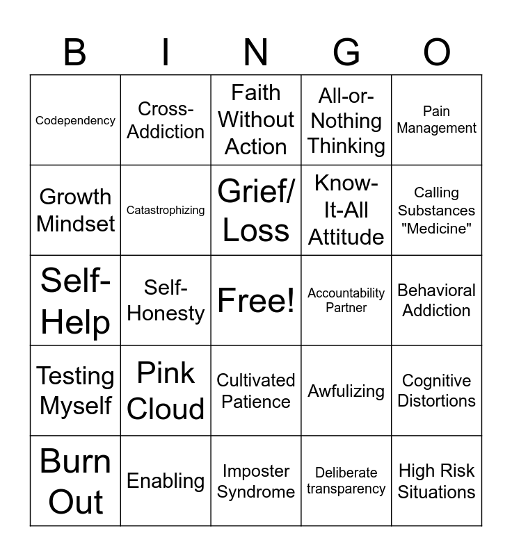 This bingo card has a free space and 47 words: Daily Stressors, High Risk Situations, People, Places, & Things, Imposter Syndrome, Pink Cloud, California Sober, Cross-Addiction, Self-Compassion, Growth Mindset, Law of Attraction, Catastrophizing, All-or-Nothing Thinking, Cognitive Distortions, Awfulizing, Exaggerated Positive Memories, Mood Disorder, Grief/ Loss, Accountability Partner, Fellowship, Pain Management, Self-Honesty, Deliberate transparency, Codependency, Know-It-All Attitude, Medical Necessity, Calling Substances "Medicine", Burn Out, Illusion of Control, Cultivated Patience, Testing Myself, Trauma Anniversary, Adverse Childhood Experiences, Ceiling Effect, PAWS, Precipitated Withdrawal, Enabling, Behavioral Addiction, IOP, Harm Reduction, Lack of Structure, Peer Support, Faith Without Action, Self-Help, Self-Care, Medical Avoidance, Pride and Ego.