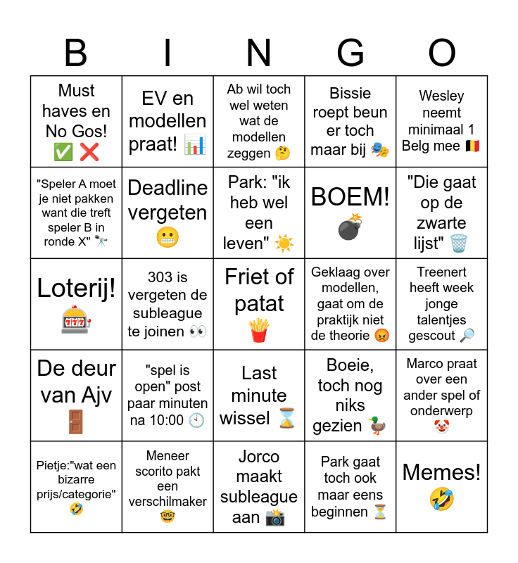 This bingo card has 25 words: "spel is open" post paar minuten na 10:00 🕙, Jorco maakt subleague aan 📸, Park: "ik heb wel een leven" ☀️, Pietje:"wat een bizarre prijs/categorie" 🤣, Wesley neemt minimaal 1 Belg mee 🇧🇪, Must haves en No Gos! ✅ ❌, "Speler A moet je niet pakken want die treft speler B in ronde X" 🔭, EV en modellen praat! 📊, Geklaag over modellen, gaat om de praktijk niet de theorie 😡, Last minute wissel ⌛, BOEM! 💣, Loterij! 🎰, Boeie, toch nog niks gezien 🦆, Marco praat over een ander spel of onderwerp 🤡, Deadline vergeten 😬, Memes! 🤣, Treenert heeft week jonge talentjes gescout 🔎, Ab wil toch wel weten wat de modellen zeggen 🤔, "Die gaat op de zwarte lijst" 🗑️, 303 is vergeten de subleague te joinen 👀, Friet of patat 🍟, Meneer scorito pakt een verschilmaker 🤓, De deur van Ajv 🚪, Bissie roept beun er toch maar bij 🎭 and Park gaat toch ook maar eens beginnen ⏳.