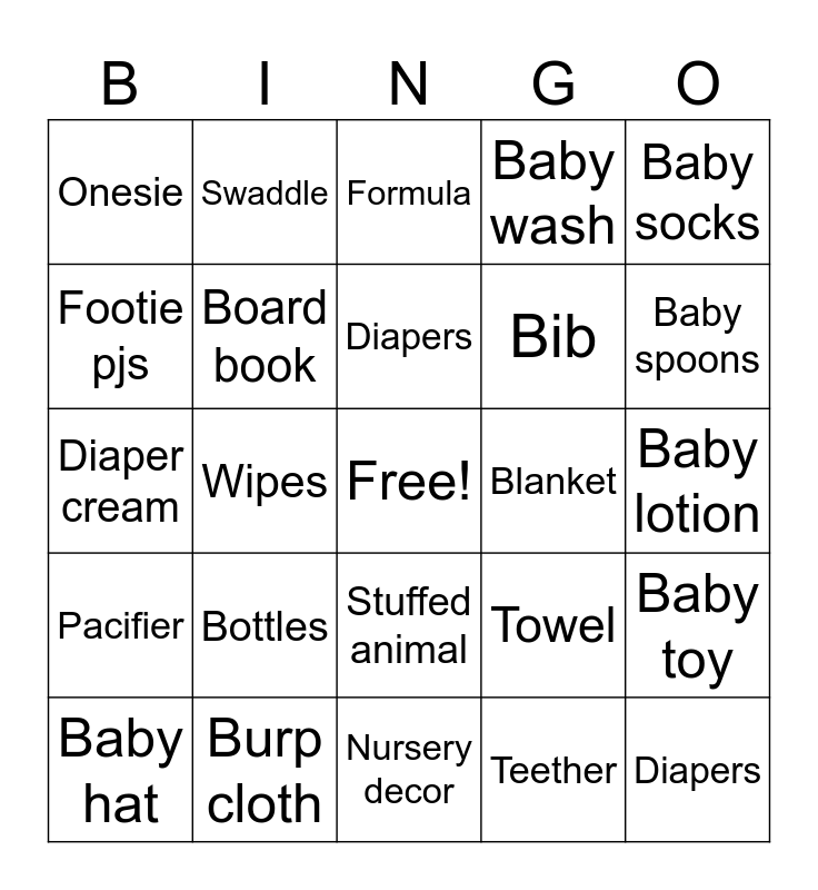 This bingo card has a free space and 24 words: Bottles, Burp cloth, Diapers, Baby hat, Baby socks, Onesie, Footie pjs, Swaddle, Blanket, Stuffed animal, Bib, Diaper cream, Towel, Baby toy, Board book, Teether, Baby lotion, Formula, Baby spoons, Wipes, Diapers, Pacifier, Baby wash and Nursery decor.
