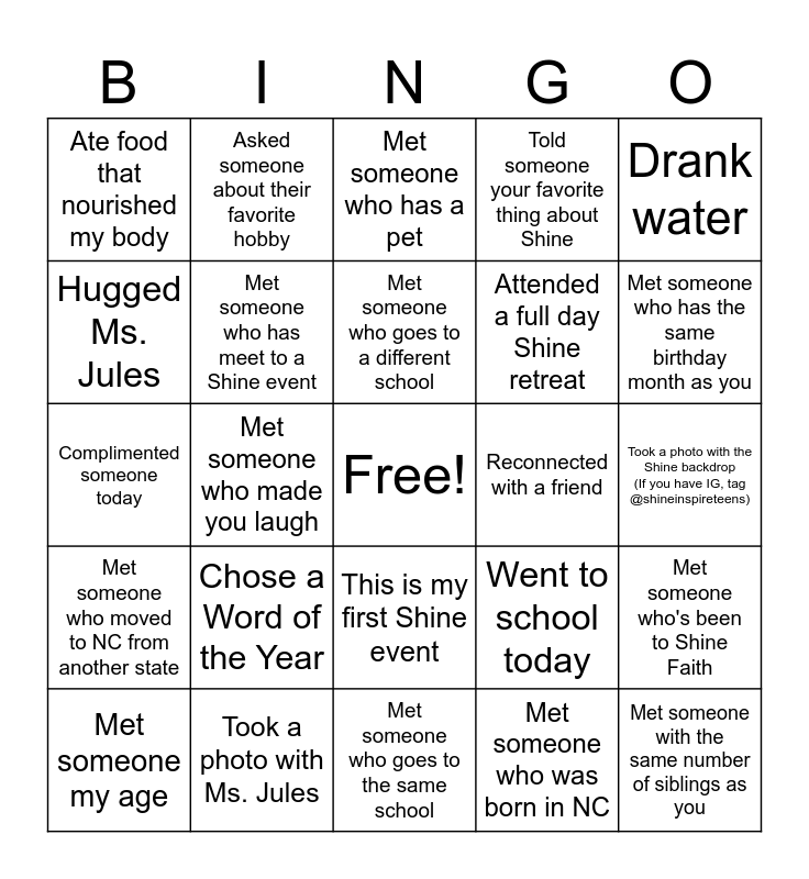 This bingo card has a free space and 25 words: Chose a Word of the Year, Met someone who goes to the same school, Met someone who goes to a different school, Met someone my age, Drank water, Ate food that nourished my body, Hugged Ms. Jules, Asked someone about their favorite hobby, Reconnected with a friend, This is my first Shine event, Attended a full day Shine retreat, Complimented someone today, Went to school today, Met someone who's been to Shine Faith, Met someone who has meet to a Shine event, Enjoyed a hot chocolate, Took a photo with the Shine backdrop (If you have IG, tag @shineinspireteens), Met someone who has a pet, Met someone who has the same birthday month as you, Met someone who made you laugh, Met someone with the same number of siblings as you, Took a photo with Ms. Jules, Met someone who moved to NC from another state, Told someone your favorite thing about Shine and Met someone who was born in NC.