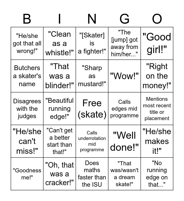 This bingo card has a free space and 24 words: "Can't get a better start than that!", "Oh, that was a cracker!", "Sharp as mustard!", "Goodness me!", "Good girl!", "He/she got that all wrong!", Butchers a skater's name, "Clean as a whistle!", Calls edges mid programme, Calls underrotation mid programme, "Wow!", Disagrees with the judges, "Well done!", "He/she makes it!", "That was a blinder!", "That was/wasn't a dream skate!", Mentions most recent title or placement, "[Skater] is a fighter!", "Right on the money!", "Beautiful running edge!", "No running edge on that...", "He/she can't miss!", "The [jump] got away from him/her..." and Does maths faster than the ISU.