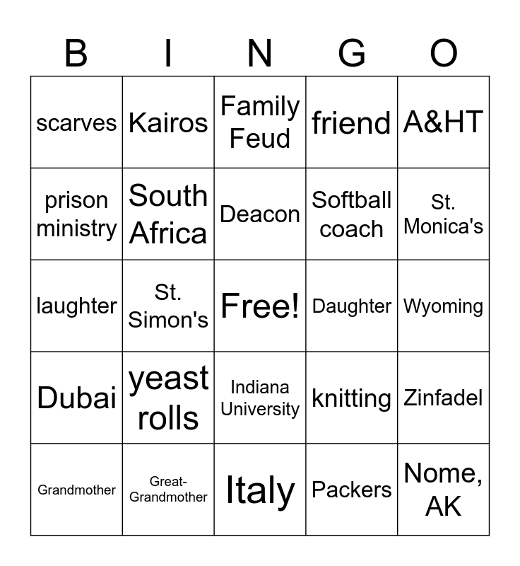 This bingo card has a free space and 42 words: Xerox, Deacon, Lincoln Heights, yeast rolls, Packers, Zinfadel, Nome, AK, gardening, Family Feud, Indiana University, Wyoming, St. Monica's, St. Simon's, A&HT, love, knitting, joyful, laughter, prayer, Kairos, prison ministry, Snoopy, Peanuts, scarves, Christmas, breezeway, Softball coach, jetsetter, Pettus Bridge, Greece, Holy Land, Dubai, South Africa, Italy, jump rope, Grandmother, Great-Grandmother, Daughter, Sister, spiritual director, friend and Companions of the Holy Cross.