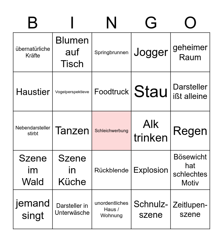 This bingo card has a free space and 24 words: Szene in Küche, Darsteller in Unterwäsche, Foodtruck, jemand singt, geheimer Raum, übernatürliche Kräfte, Haustier, Blumen auf Tisch, Alk trinken, Rückblende, Stau, Nebendarsteller stirbt, Explosion, Bösewicht hat schlechtes Motiv, Vogelperspektieve, Schnulz- szene, Regen, Springbrunnen, Darsteller ißt alleine, Tanzen, Zeitlupen- szene, Szene im Wald, Jogger and unordentliches Haus / Wohnung.