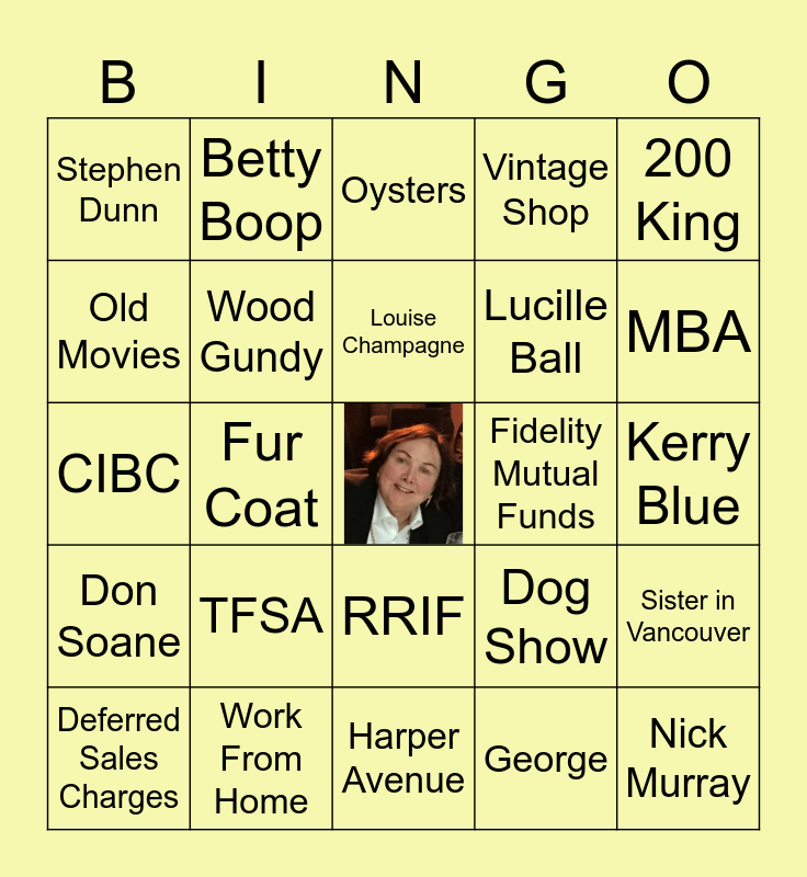 This bingo card has a free space and 32 words: George, Betty the Dog, Fur Coat, IBM, Don Soane, Wood Gundy, 200 King, Sister in Vancouver, Betty Boop, Interest Rates, Louise Champagne, Oysters, Elvis Presley, Memphis, Fidelity Mutual Funds, Value Line, Deferred Sales Charges, CIBC, RRIF, TFSA, Dog Show, White Shirt, Black Pants, Kerry Blue, Work From Home, Nick Murray, Vintage Shop, Lucille Ball, Old Movies, Stephen Dunn, Harper Avenue, York University and MBA.
