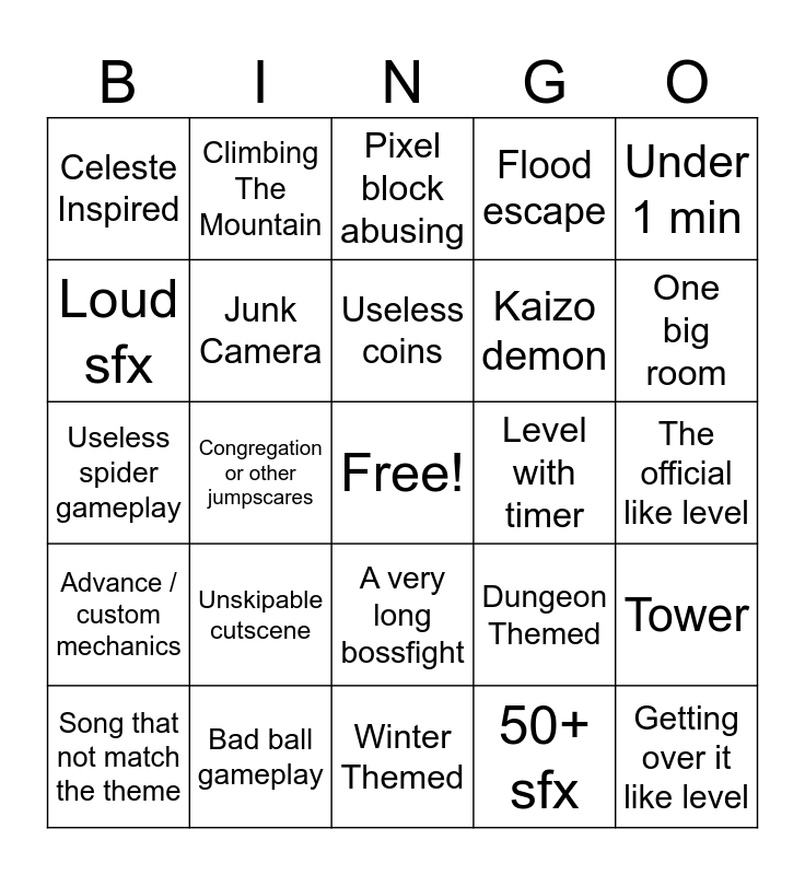 This bingo card has a free space and 24 words: Song that not match the theme, Unskipable cutscene, Useless coins, 50+ sfx, Under 1 min, Celeste Inspired, Climbing The Mountain, Pixel block abusing, Level with timer, The official like level, Useless spider gameplay, Junk Camera, Dungeon Themed, Tower, Loud sfx, Bad ball gameplay, Winter Themed, Flood escape, One big room, Advance / custom mechanics, Congregation or other jumpscares, A very long bossfight, Kaizo demon and Getting over it like level.