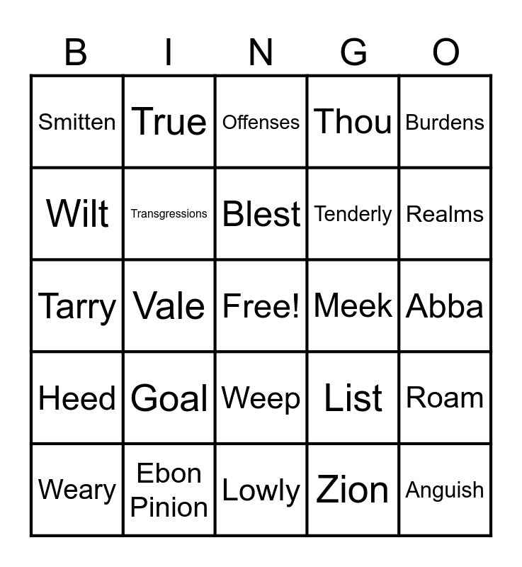 This bingo card has a free space and 30 words: Ebon Pinion, Brooded, Vale, Prostate, Smitten, Offenses, Transgressions, Weep, Meek, Lowly, Abba, Anguish, Zion, Bidding, Realms, Throne, List, Heed, Goal, Burdens, Tarry, Labor, True, Tenderly, Wilt, Thou, Roam, Weary, Blest and Thy.