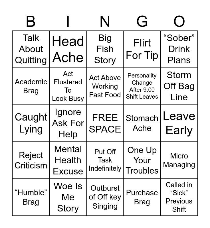 This bingo card has a free space and 24 words: Mental Health Excuse, Woe Is Me Story, Act Above Working Fast Food, “Humble” Brag, “Sober” Drink Plans, Talk About Quitting, Academic Brag, Head Ache, Stomach Ache, Put Off Task Indefinitely, Personality Change After 9:00 Shift Leaves, Caught Lying, One Up Your Troubles, Micro Managing, Act Flustered To Look Busy, Purchase Brag, Leave Early, Big Fish Story, Storm Off Bag Line, Ignore Ask For Help, Called in “Sick” Previous Shift, Reject Criticism, Flirt For Tip and Outburst of Off key Singing.