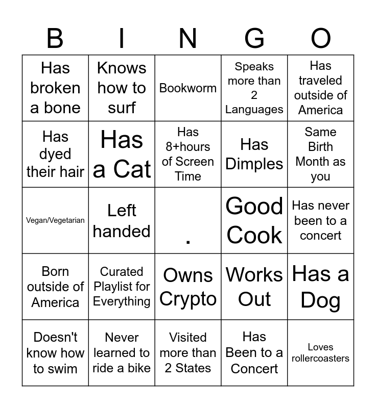 This bingo card has a free space and 24 words: Curated Playlist for Everything, Never learned to ride a bike, Has 8+hours of Screen Time, Doesn't know how to swim, Has traveled outside of America, Has broken a bone, Has dyed their hair, Knows how to surf, Good Cook, Owns Crypto, Has Dimples, Vegan/Vegetarian, Works Out, Has a Dog, Has a Cat, Has Been to a Concert, Has never been to a concert, Bookworm, Same Birth Month as you, Left handed, Loves rollercoasters, Born outside of America, Speaks more than 2 Languages and Visited more than 2 States.