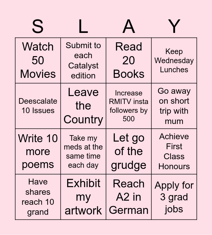 This bingo card has 16 words: Exhibit my artwork, Achieve First Class Honours, Read 20 Books, Watch 50 Movies, Write 10 more poems, Submit to each Catalyst edition, Let go of the grudge, Reach A2 in German, Deescalate 10 Issues, Leave the Country, Have shares reach 10 grand, Keep Wednesday Lunches, Take my meds at the same time each day, Go away on short trip with mum, Increase RMITV insta followers by 500 and Apply for 3 grad jobs.
