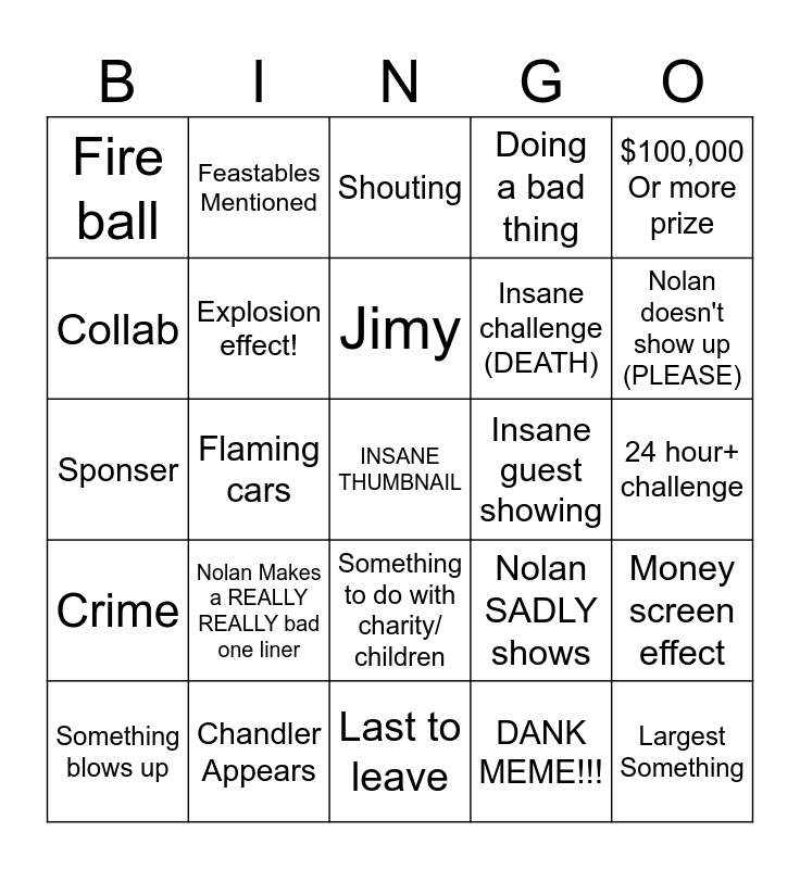 This bingo card has a free space and 24 words: Nolan Makes a REALLY REALLY bad one liner, Chandler Appears, Jimy, Something blows up, $100,000 Or more prize, Fire ball, Collab, Feastables Mentioned, Insane guest showing, Something to do with charity/ children, Insane challenge (DEATH), Sponser, Nolan SADLY shows, Money screen effect, Explosion effect!, DANK MEME!!!, 24 hour+ challenge, Shouting, Nolan doesn't show up (PLEASE), Flaming cars, Largest Something, Crime, Doing a bad thing and Last to leave.