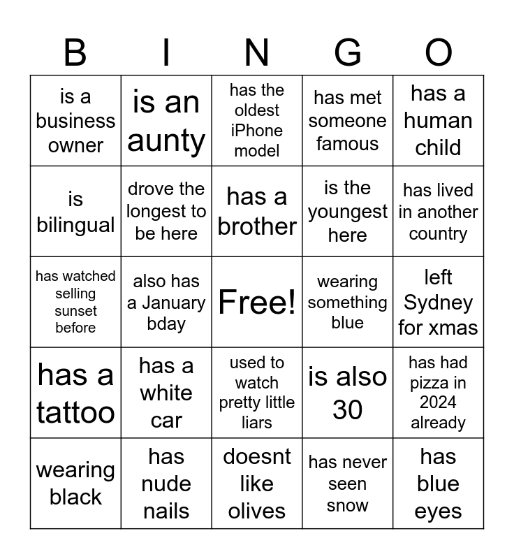 This bingo card has a free space and 27 words: is also 30, has the largest sized pet, is the youngest here, doesnt like olives, is bilingual, has the oldest iPhone model, is an aunty, has a tattoo, wearing something blue, has had pizza in 2024 already, has watched selling sunset before, has met someone famous, wearing black, has nude nails, has lived in another country, has done a dance class before, drove the longest to be here, has a brother, has a white car, is a business owner, left Sydney for xmas, has never seen snow, also has a January bday, has blue eyes, used to watch pretty little liars, has a human child and run some kind of marathon.
