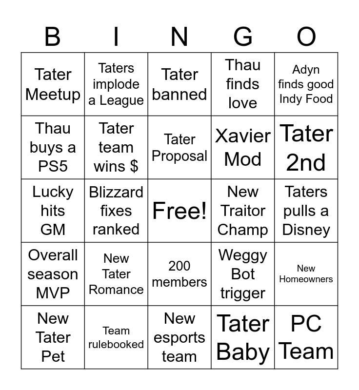 This bingo card has a free space and 24 words: New Tater Pet, New Tater Romance, Tater Proposal, Tater Baby, Adyn finds good Indy Food, Tater Meetup, Taters implode a League, Tater banned, New Traitor Champ, Taters pulls a Disney, Lucky hits GM, Tater team wins $, Weggy Bot trigger, New Homeowners, Thau buys a PS5, Team rulebooked, New esports team, Thau finds love, Tater 2nd, Overall season MVP, Blizzard fixes ranked, 200 members, Xavier Mod and PC Team.