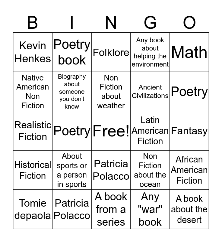 This bingo card has a free space and 24 words: About sports or a person in sports, Patricia Polacco, Non Fiction about weather, Tomie depaola, Math, Kevin Henkes, Native American Non Fiction, Poetry book, Latin American Fiction, Patricia Polacco, Ancient Civilizations, Realistic Fiction, Non Fiction about the ocean, African American Fiction, Biography about someone you don't know, Any "war" book, Fantasy, Folklore, Poetry, Poetry, A book about the desert, Historical Fiction, Any book about helping the environment and A book from a series.
