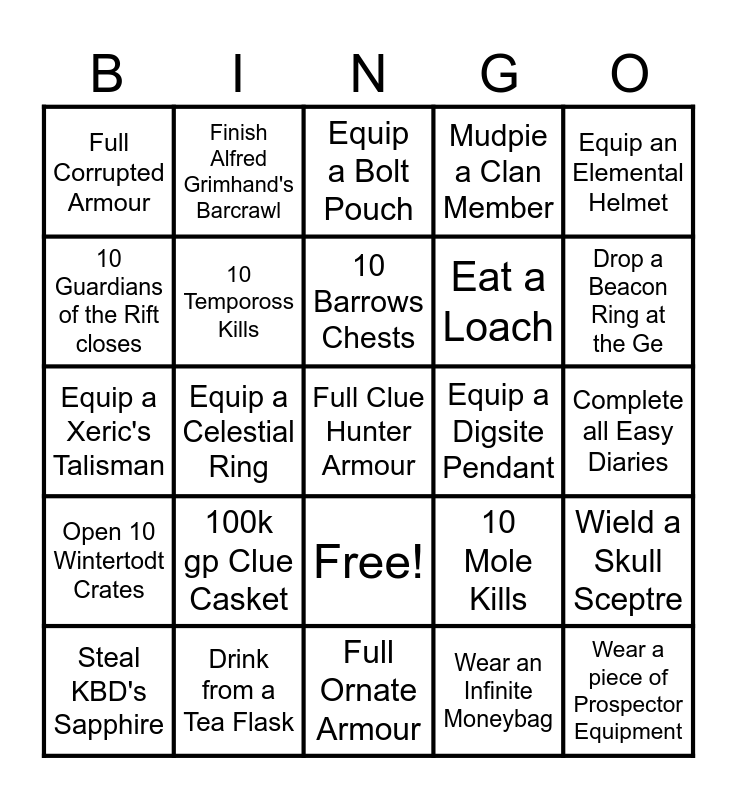 This bingo card has 26 words: Free!, Wear an Infinite Moneybag, 10 Barrows Chests, Drink from a Tea Flask, Equip an Elemental Helmet, Full Corrupted Armour, 10 Guardians of the Rift closes, Finish Alfred Grimhand's Barcrawl, Complete all Easy Diaries, 10 Mole Kills, Eat a Loach, Equip a Xeric's Talisman, Wield a Skull Sceptre, Steal KBD's Sapphire, Equip a Celestial Ring, Wield an Imcando Hammer, Mudpie a Clan Member, Open 10 Wintertodt Crates, Equip a Bolt Pouch, Full Clue Hunter Armour, Drop a Beacon Ring at the Ge, Full Ornate Armour, Equip a Digsite Pendant, 100k gp Clue Casket, 10 Tempoross Kills and Wear a piece of Prospector Equipment.