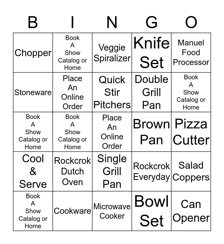 This bingo card has a free space and 24 words: Rockcrok Dutch Oven, Cookware, Quick Stir Pitchers, Book A Show Catalog or Home, Manuel Food Processor, Chopper, Stoneware, Book A Show Catalog or Home, Brown Pan, Single Grill Pan, Double Grill Pan, Book A Show Catalog or Home, Rockcrok Everyday, Salad Coppers, Place An Online Order, Bowl Set, Pizza Cutter, Veggie Spiralizer, Book A Show Catalog or Home, Book A Show Catalog or Home, Can Opener, Cool & Serve, Knife Set and Microwave Cooker.