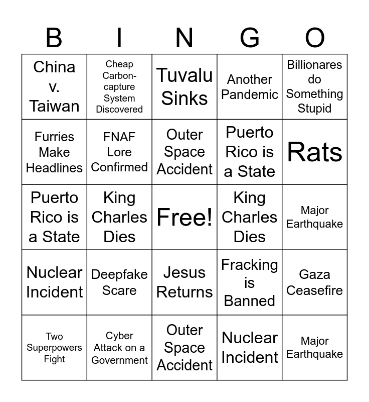This bingo card has a free space and 45 words: Nene Goose is not Endangered, Major Earthquake, U.S. Economy Goes Into Recession, Two Superpowers Fight, Fracking is Banned, Nuclear Incident, Tuvalu Sinks, Gaza Ceasefire, Billionares do Something Stupid, Cyber Attack on a Government, Another Pandemic, King Charles Dies, Jesus Returns, Deepfake Scare, Disney Goes Bankrupt, Outer Space Accident, Furries Make Headlines, Puerto Rico is a State, New Stupid Diet Trending, Rats, Cheap Carbon-capture System Discovered, Polio is Eradicated, Major Controversy With Mickey Mouse, China v. Taiwan, CGI Nene Goose is not Endangered, Major Earthquake, U.S. Economy Goes Into Recession, Two Superpowers Fight, Fracking is Banned, Nuclear Incident, Tuvalu Sinks, Gaza Ceasefire, Billionares do Something Stupid, Cyber Attack on a Government, Another Pandemic, King Charles Dies, Jesus Returns, Deepfake Scare, Disney Goes Bankrupt, Outer Space Accident, Furries Make Headlines, Puerto Rico is a State, Solar Flare, FNAF Lore Confirmed and World Leader Assassinated.
